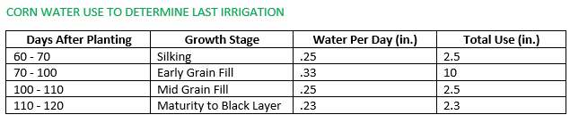 As most everyone is approaching tassel, and many are well beyond, let’s take a look at later-stage water needs in corn as a guide for termination decisions.