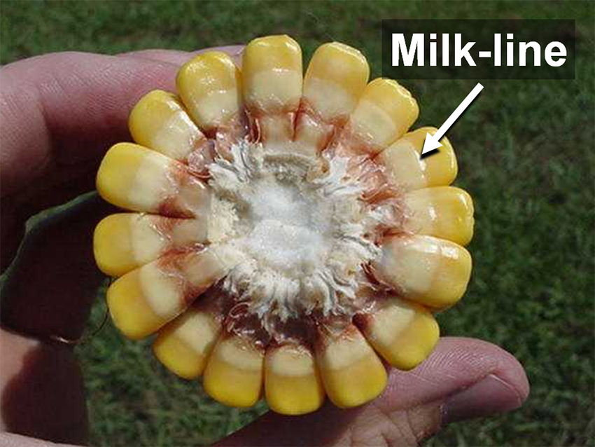 Kernels mature from the outside-in when hard starch begins forming at the crown. The crown will turn hard and become the bright shiny golden yellow color of mature kernels. This starch and weight accumulation will steadily progress towards the base of the kernel (where it attaches to the cob) taking about 20 days to complete. The most reliable method for you to monitor kernel maturity for irrigation scheduling purposes is to observe this progression of the milk-line (or hard starch layer) between dent stage and black-layer. The milk-line is more relevant than the black layer, because it indicates maturation progress, before the black layer is evident. The milk-line is the borderline between the bright, golden yellow color of the hard seed coat outside the starch, compared to the milky, dull yellow color of the soft seed coat adjacent the dough layer. To observe the milk line, break a corn ear in half and observe the cross-section of the top half of the ear (the side of kernels opposite the embryo.) If you have difficulty seeing this color disparity between layers, you can easily find it by simply poking your fingernail into the soft, doughy seed, starting at the kernel base and repeating this procedure progressively toward the tip, until you feel the hard starch.