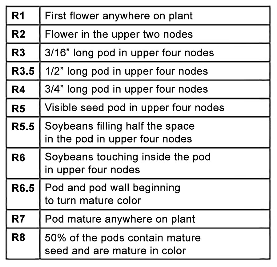 With this in mind, the first step in determining when to initiate irrigation in your beans is to properly identify the growth stage of the crop. The commonly recognized soybean reproductive growth stages are as follows: