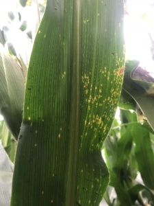 “Lesions appear mostly in the upper canopy with gray centers and maroon margins. Normally the area on a leaf infected will be an inch in diameter with several small lesions present. However, in some rare cases the area infected can tend to the majority of a leaf or two. The lesions as a result of Curvularia leaf spot are caused with excessive dew or sporadic rainfall. Over the past five seasons I have observed an increase in this particular disease, but the disease does not occur every year. During 2015 I evaluated corn plots that were sprayed with fungicides since that season there were so many questions about Curvularia leaf spot. Essentially, fungicides were not effective at managing this particular disease, but with that statement the disease did not dramatically increase. In general, what you see now is all you will get with this particular disease. I suspect that some hybrids are more sensitive to this fungus than others. However, it is also likely that the disease is more of an issue in certain areas of fields where the environment is more conducive such as situations where the dew remains on plants or areas of fields are shaded for longer periods of time.”